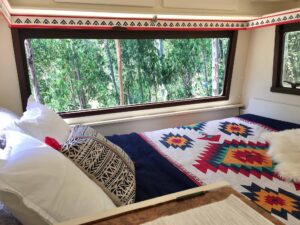 The caravan is covered by a solid wooden structure made of Eucalyptus trees from the land.