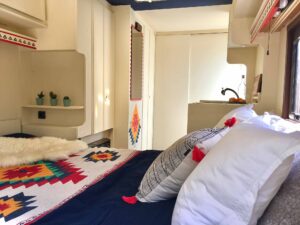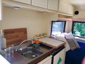 Covered retro campervan with wooden deck in front. Ideal for accommodating guests, up to 3 people.